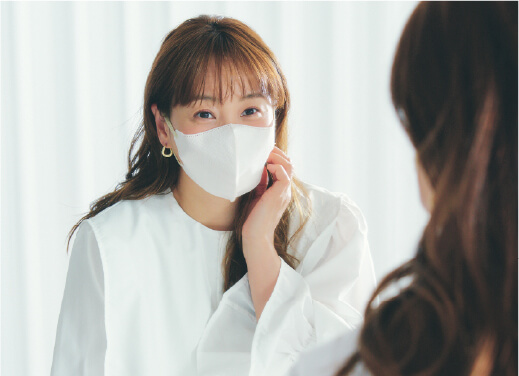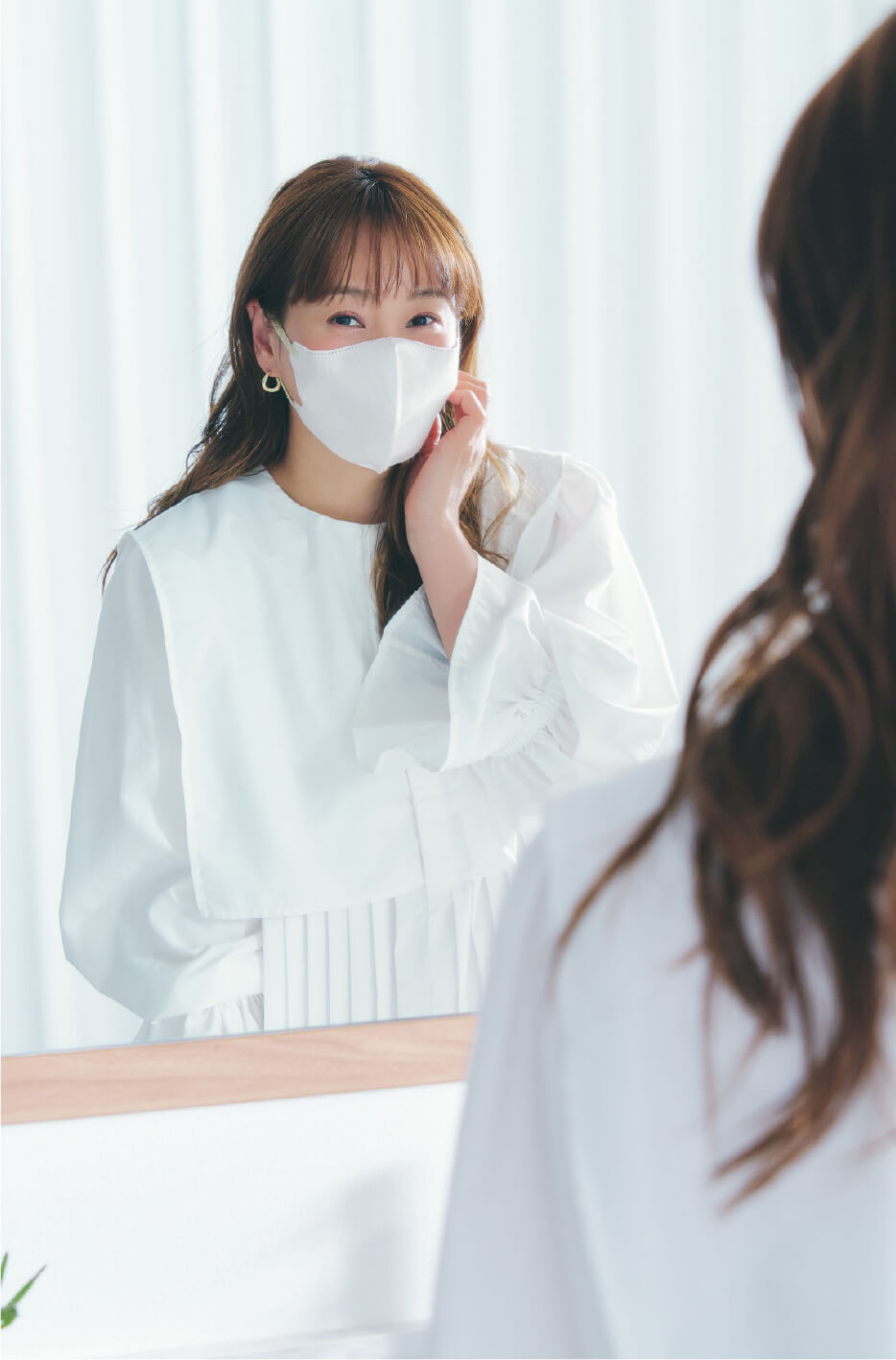 イエベ&ブルべ肌になじみやすいホワイトに、かわいい印象を与えるワインレッドの耳ゴムカラー。